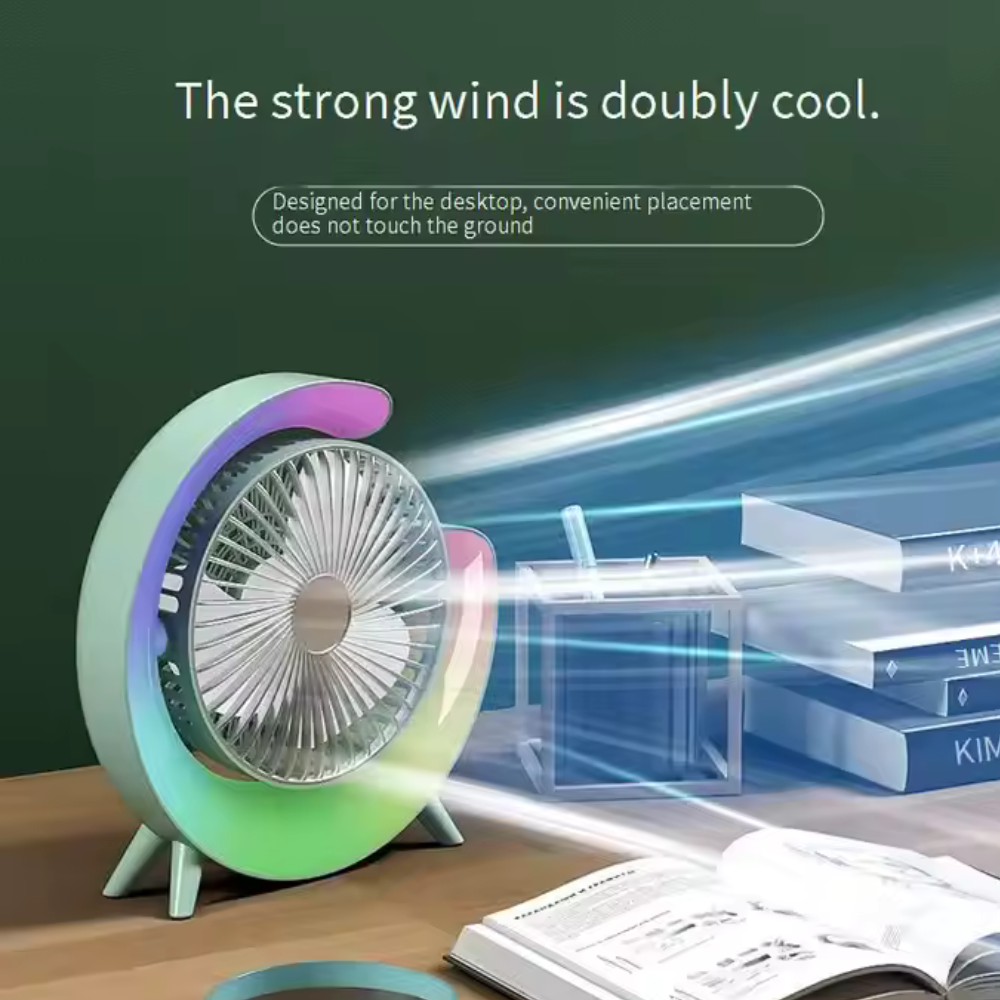 Ventilator Portabil cu Iluminare LED RGB – 3 Viteze, 5 Moduri Lumină, Reglabil 180°, USB | Birou, Mașină, Camping